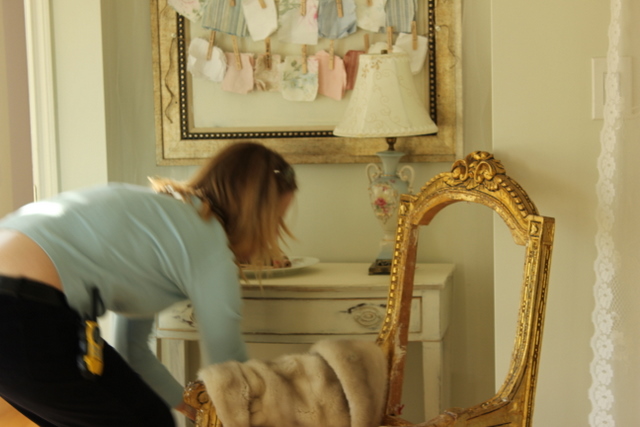 Draping the fur on the chair~you can see the walkie talkie on my hip~while I was busy hanging crystals and changing out the rod upstairs, Brenda was downstairs shooting the kitchen.