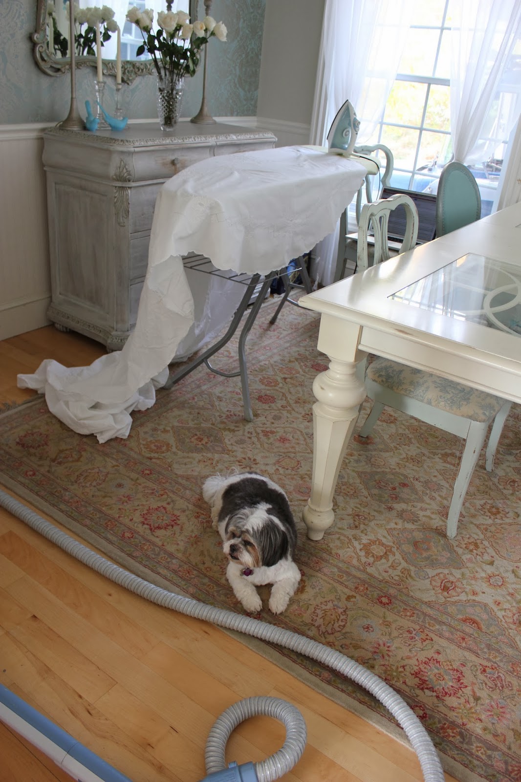 while his mother is busy ironing a white table cloth and vacuuming the house.
